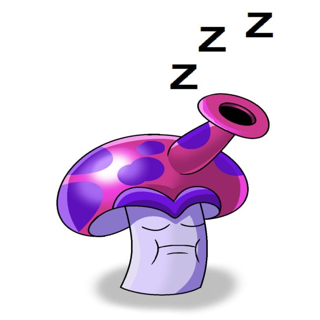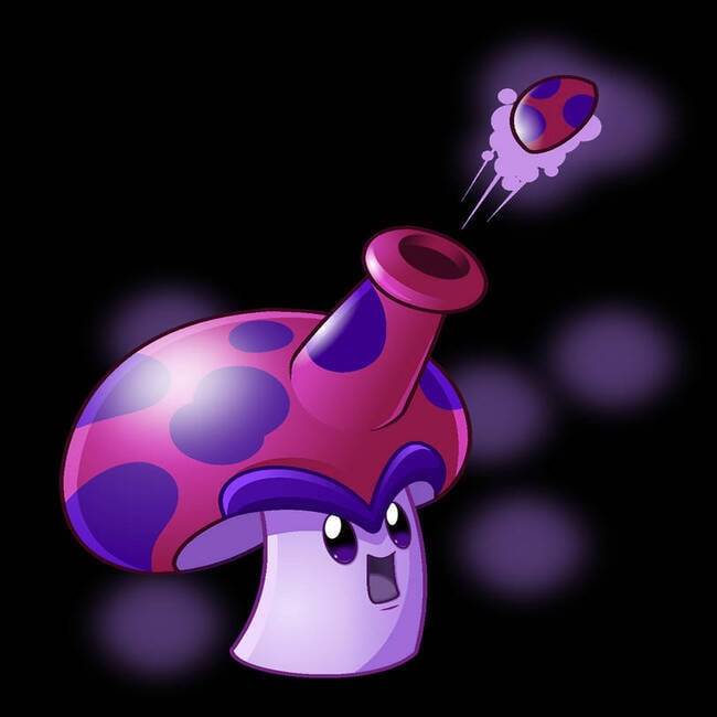 This is an image of Spore-shroom which is a mushroom and is the fifth plant obtained during the Neon Mixtape Tour in Plants vs. Zombies 2.