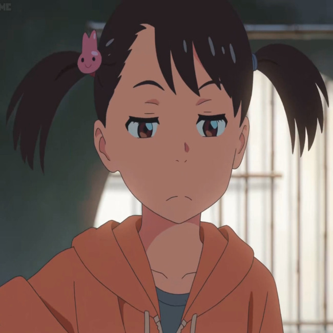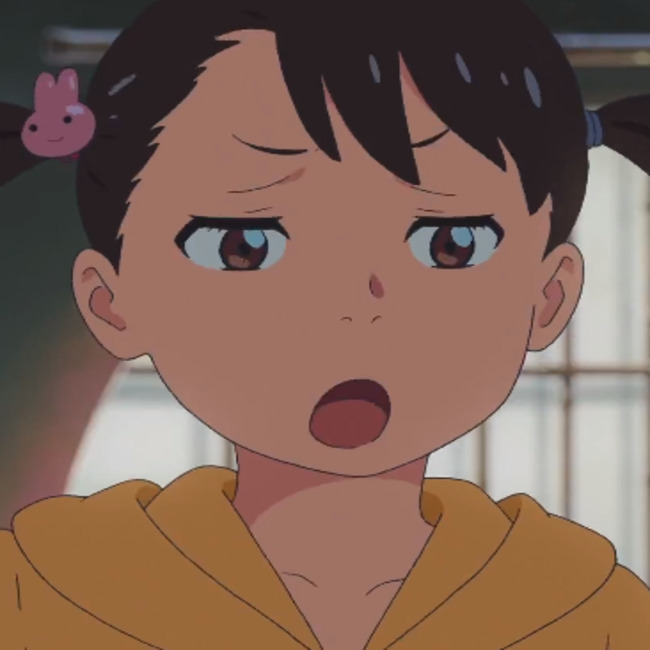 Yotsuha is a young girl with light brown eyes and black hair, she braids with two different headbands. She is usually seen wearing a blue t-shirt with an orange hoodie on top, white shorts, pink knee-length socks, and brown shoes.